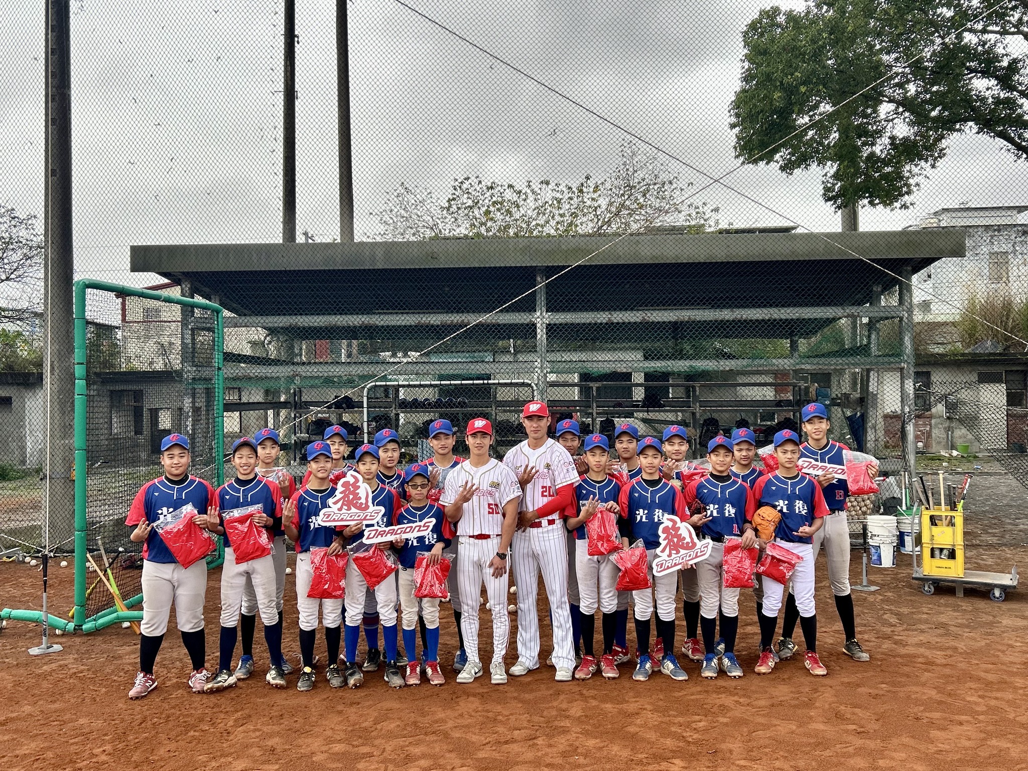 中職味全龍隊今天跟頂新和德文教基金會合作,推出由龍將曾聖安、吳俊杰代表到花蓮縣光復國中捐贈交通車,並化身一日教練,傳授投打技巧。