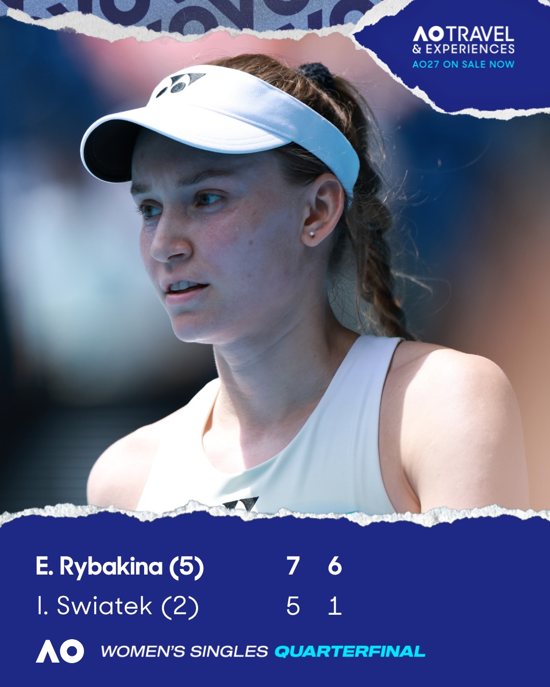 Elena Rybakin今天以7比5、6比1,擊敗世界第二的Iga Swiatek晉級澳網女單四強。官網報導,Rybakin再度證明自己是大賽型選手,這也是她對世界前10的選手8連勝。