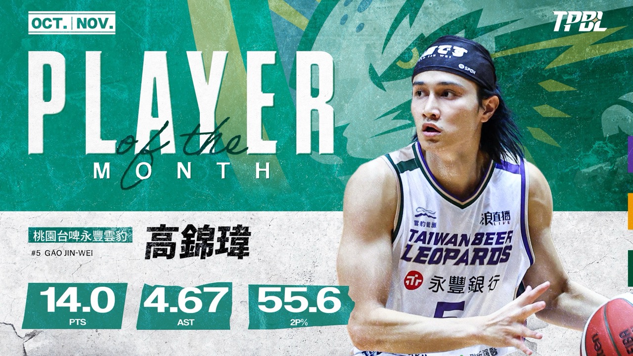 桃園台啤永豐雲豹在開季打出強勢內容,聯盟今天公布10、11月的單月獎項,高錦瑋獲選10、11月 MVP、克羅馬(Lasannah Kromah)則拿下最佳外援,成為本季首對「同隊雙獎」組合。
