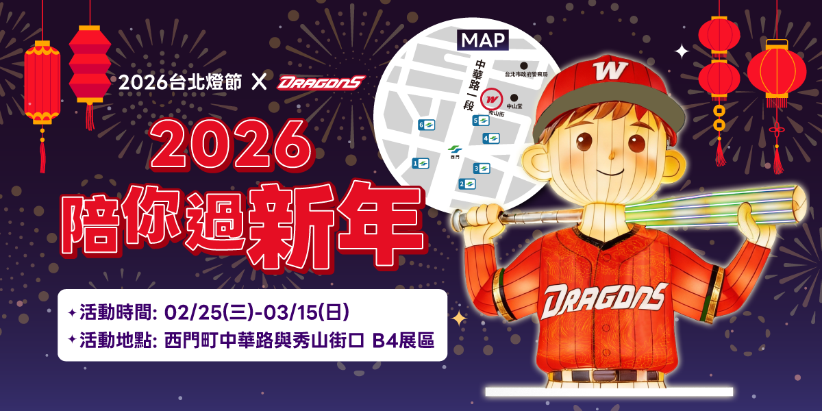 2026台北燈節即日起於台北西門町與花博園區璀璨登場。頂新和德文教基金會攜手味全龍打造《台北主場・奔龍而上》燈組,邀請棒球迷在光影中,走進屬於自己的主場時刻。3月1日晚間除將有球星曹祐齊現身與民眾互動,味全公司、德克士炸雞也將在現場發送限量贈品。