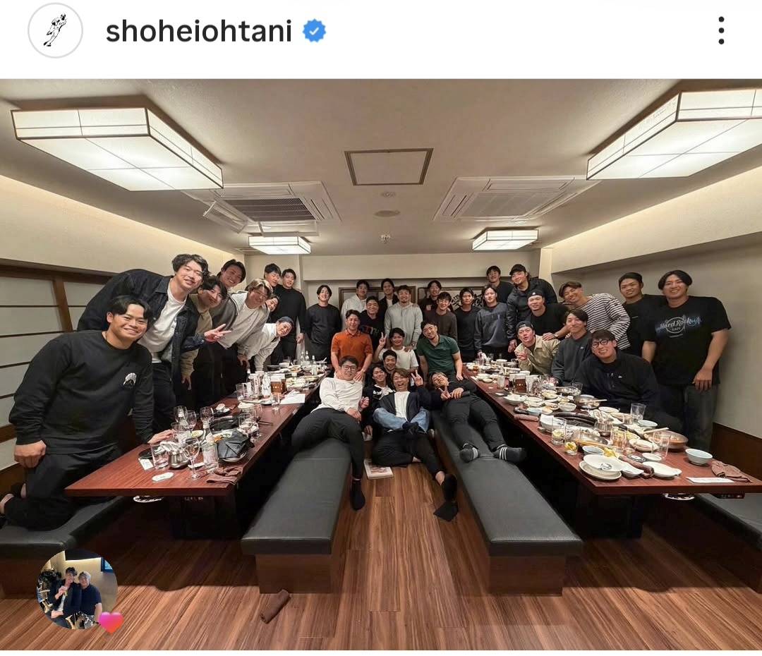 經典賽日本隊今搭乘新幹線前往大阪,準備明、後天在京瓷巨蛋的2場官辦熱身賽。超級球星大谷翔平在稍晚於社群平台IG貼出1張日本隊友聚餐照片,並寫上,「明天大家一起加油。」展現代表隊的團結力。