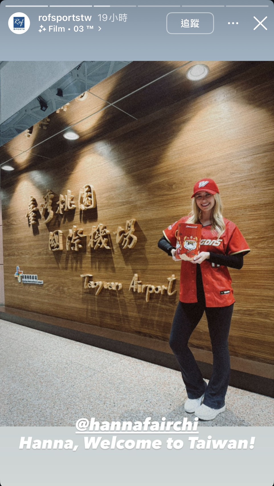 味全龍將於4月3至5日在天母棒球場進行主場開季3連戰,台美混血經典賽台灣隊國手「費仔」Stuart Fairchild的妻子「費嫂」Hanna Fairchild 5日受邀來台開球,還會站上應援舞台一起為球員加油,昨日她已經「代夫出征」抵台,老公費仔也轉貼她的消息。