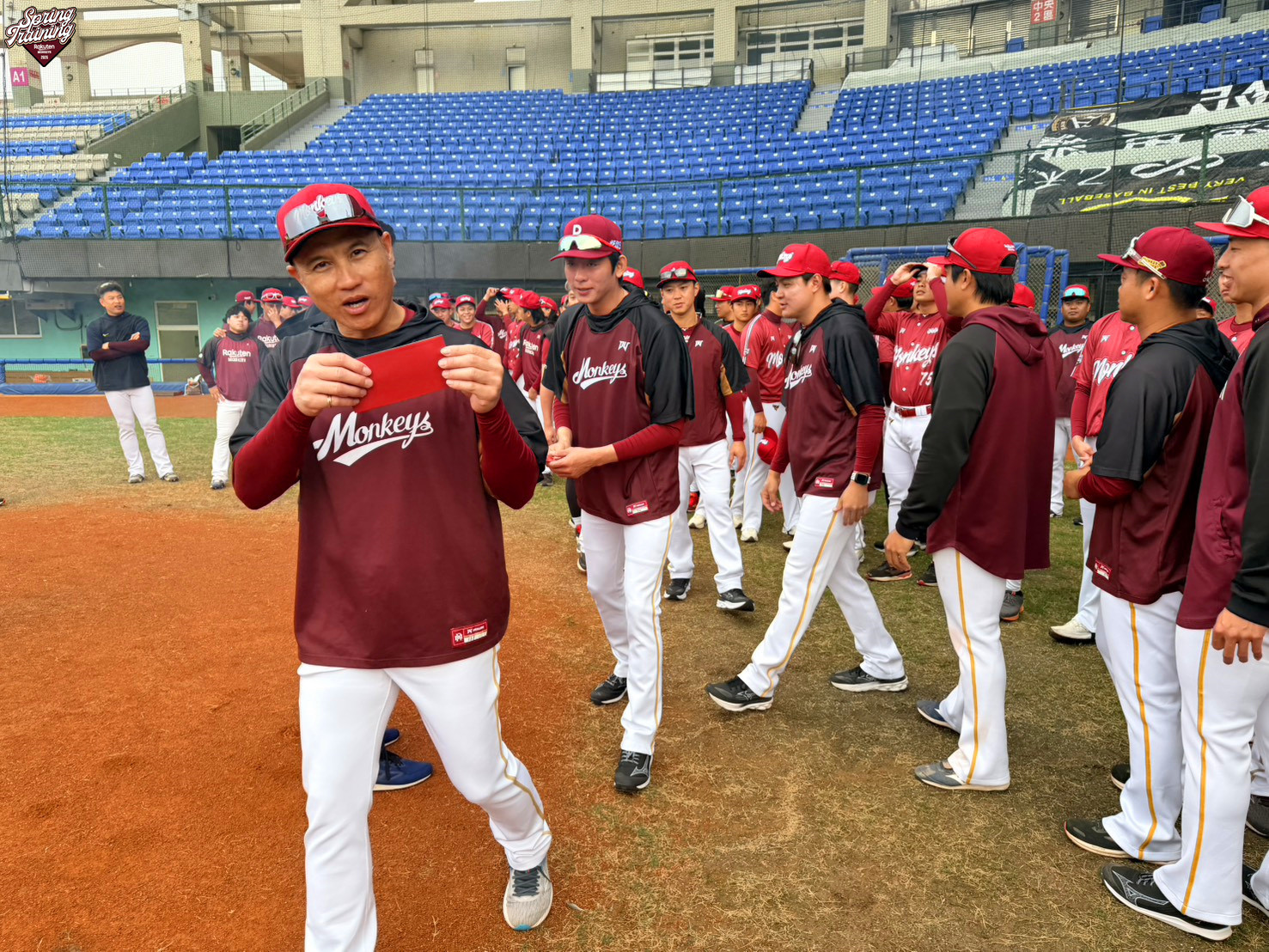 短暫放完農曆年假,樂天桃猿今在台東棒球場展開年後春訓,副領隊礒江厚綺發送開工紅包,為新的一年揭開序幕。