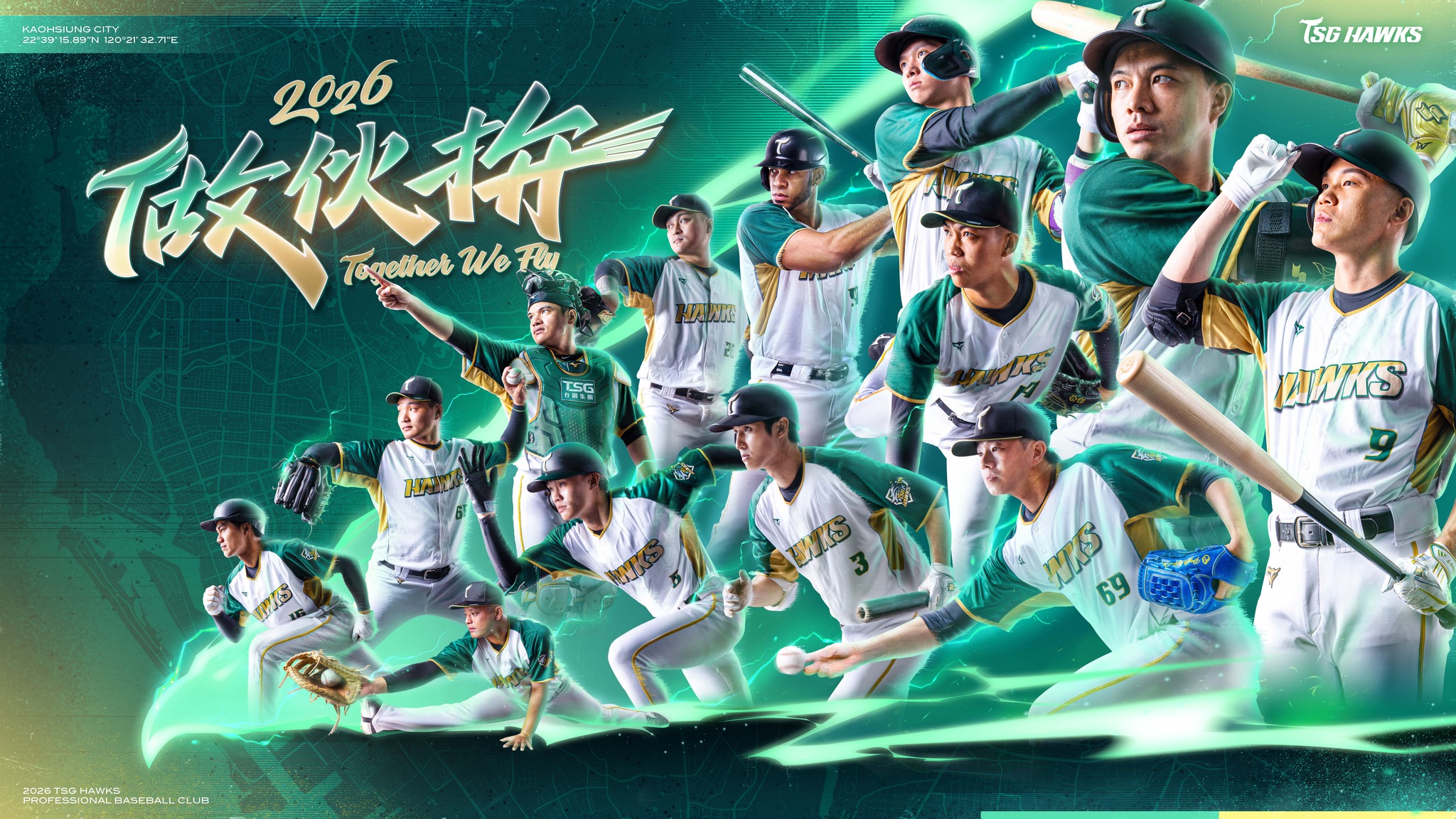 台鋼雄鷹已於上週開訓,今天在社群平台公開2026年主視覺,放上13位主力球員,包括以自由球員加盟的投手黃子鵬,搭配年度口號「做伙拚」,繼續強調跟主場高雄的緊密結合。