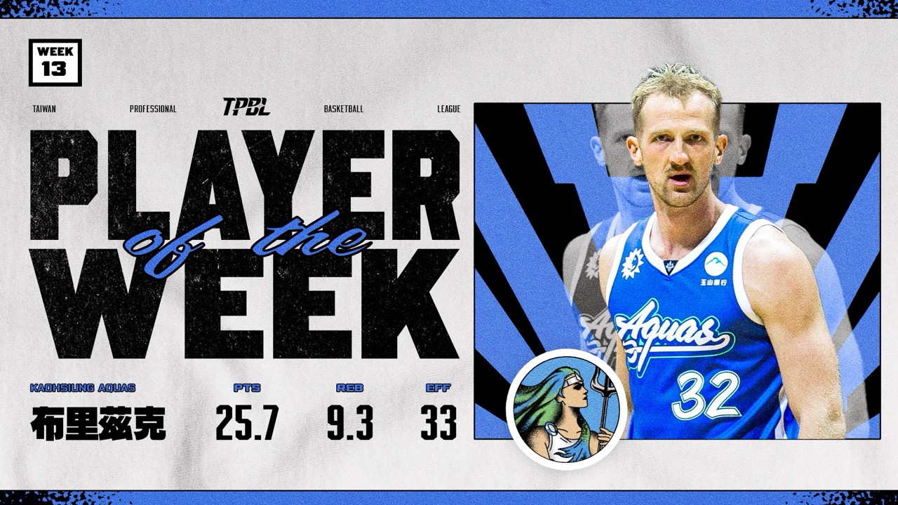 高雄全家海神上週在主場迎戰臺北台新戰神、新北中信特攻與新竹御嵿攻城獅,在賽程密集、人員吃緊的情況下,布里茲克持續扮演中樞角色,帶領海神拿下兩場勝利,並憑藉出色表現獲選為第十三週單週最有價值球員(MVP)。