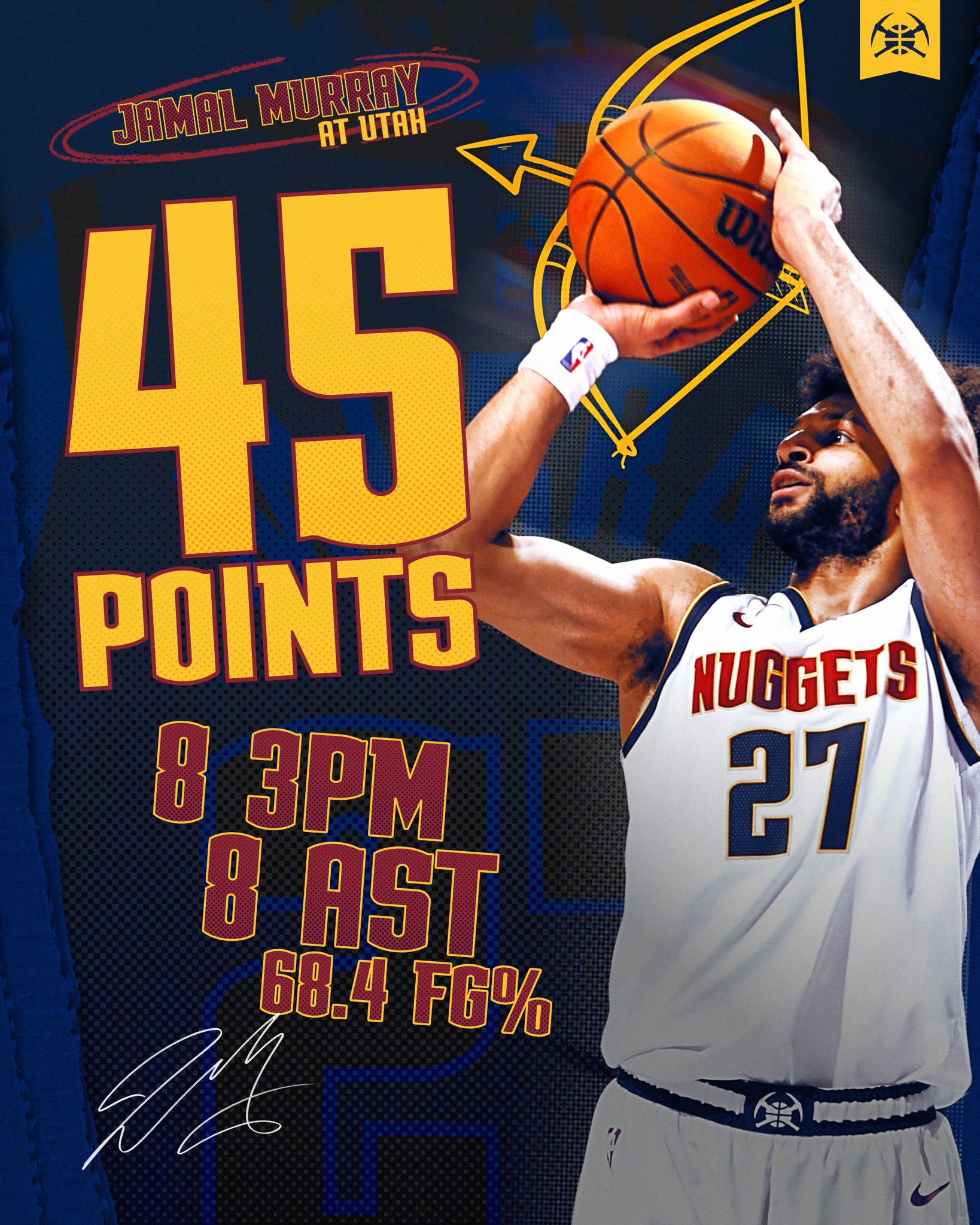 丹佛金塊今天作客鹽湖城,Jamal Murray狂砍45分,並在終場前31.8秒命中超前罰球,幫助球隊以128比125力克人手短缺的猶他爵士。