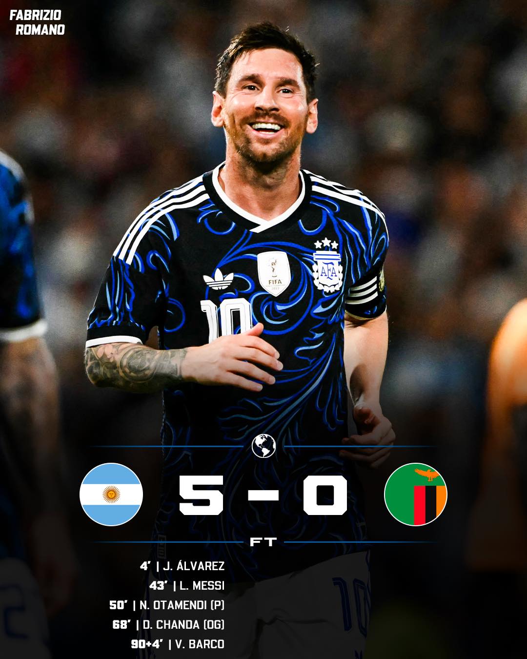 38歲的Lionel Messi已經進入生涯後期,今天在他的帶領下,阿根廷於世界盃熱身賽以5比0大勝尚比亞。跟重要的是,這場比賽也是阿根廷尋求衛冕前,Lionel Messi於主場與球迷的感性告別戰。