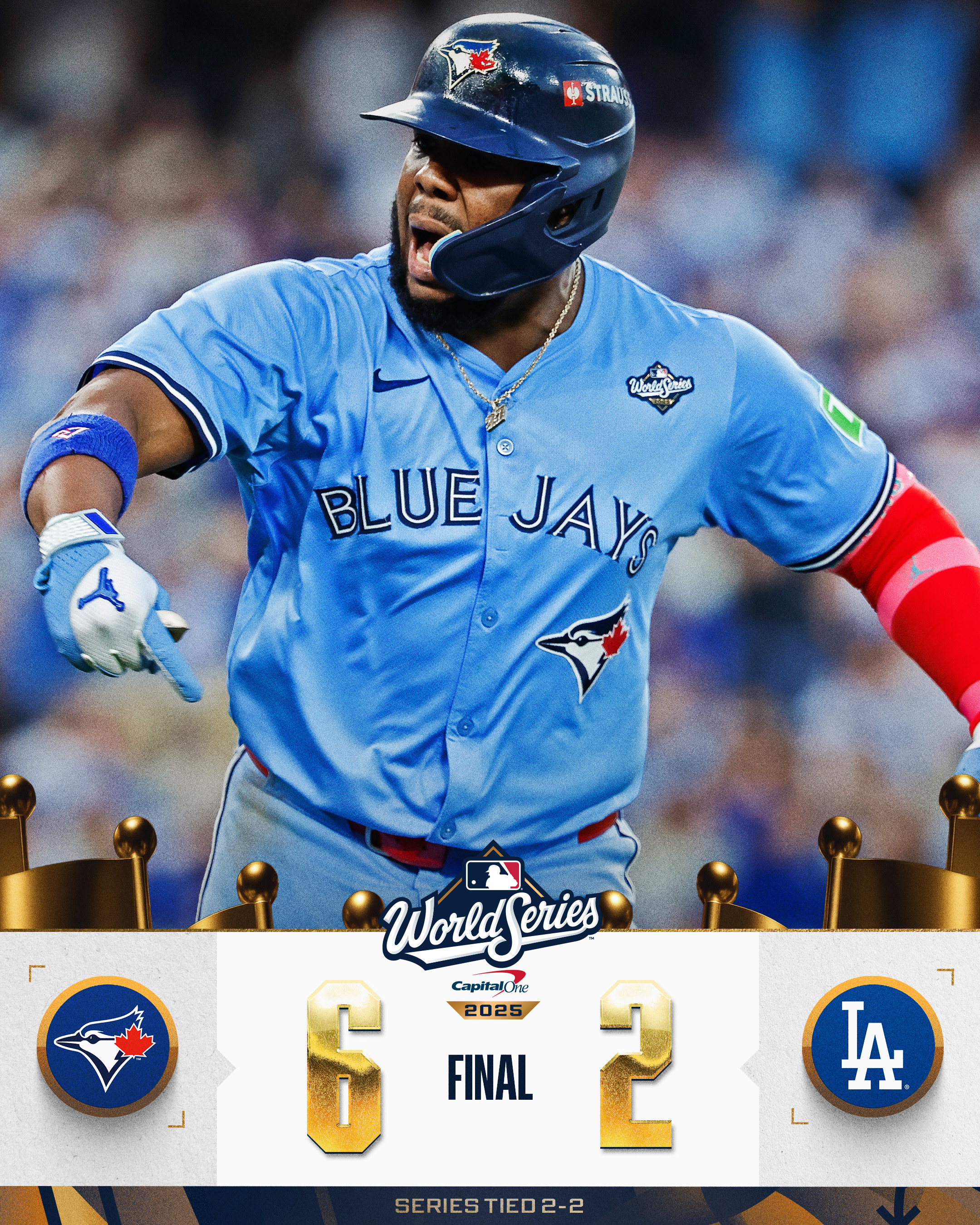在生涯首場世界大賽投打二刀流出賽中,洛杉磯道奇球星大谷翔平今天先發6局又2名打者,投出6三振但丟掉4分,包括在3局上被多倫多藍鳥球星Vladimir Guerrero Jr.轟出2分砲。最終藍鳥以6比2擊敗道奇,在世界大賽追成2勝2敗平手。